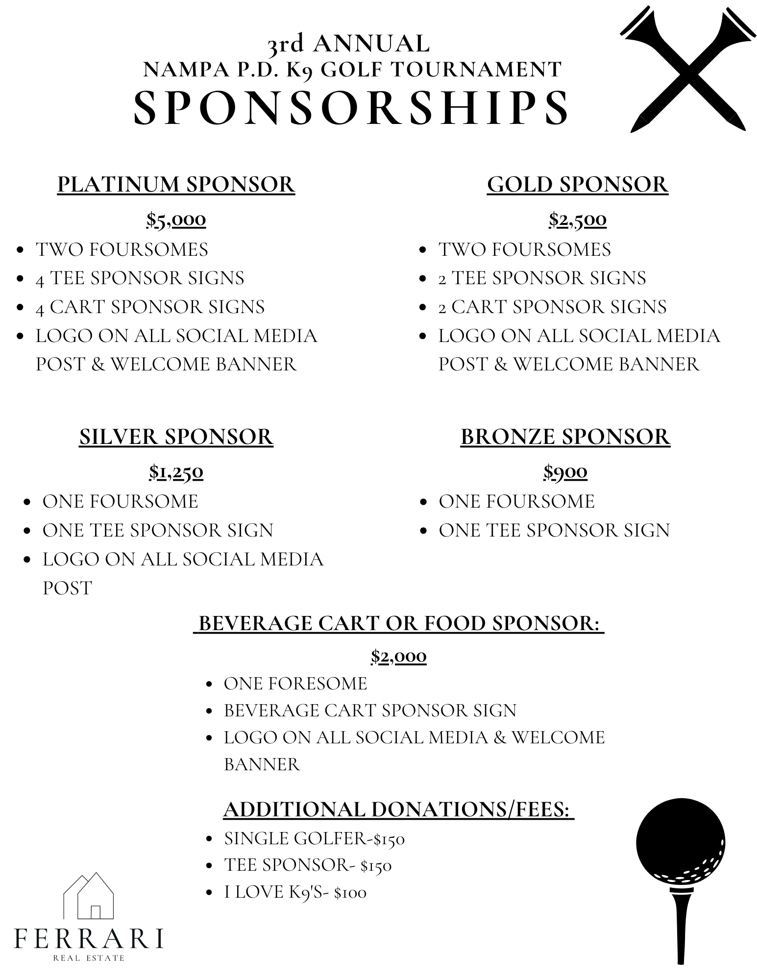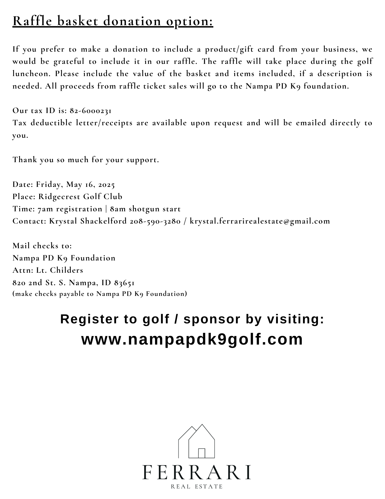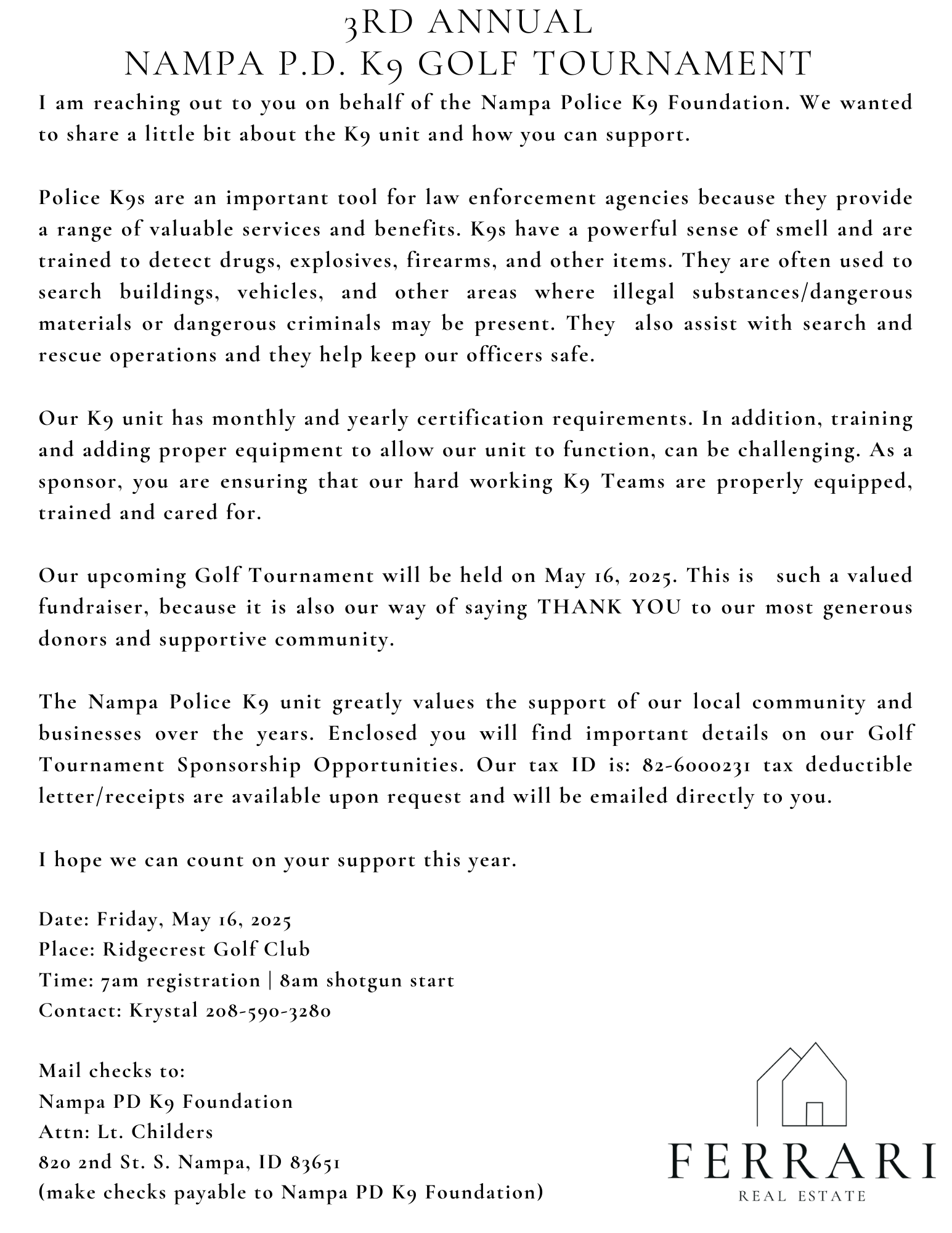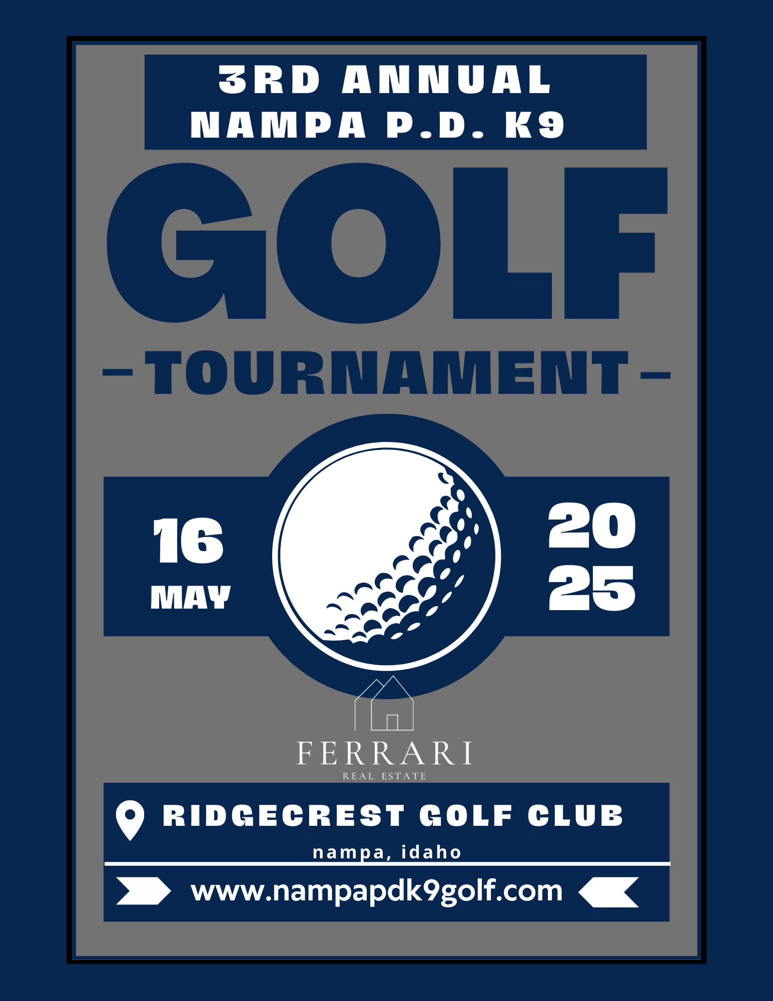 Our 3rd Annual Nampa PD K9 Foundation Golf Tournament will be held on May 16, 2025. This is such a valued fundraiser, because it is also our way of saying THANK YOU to our most generous donors and supportive community.